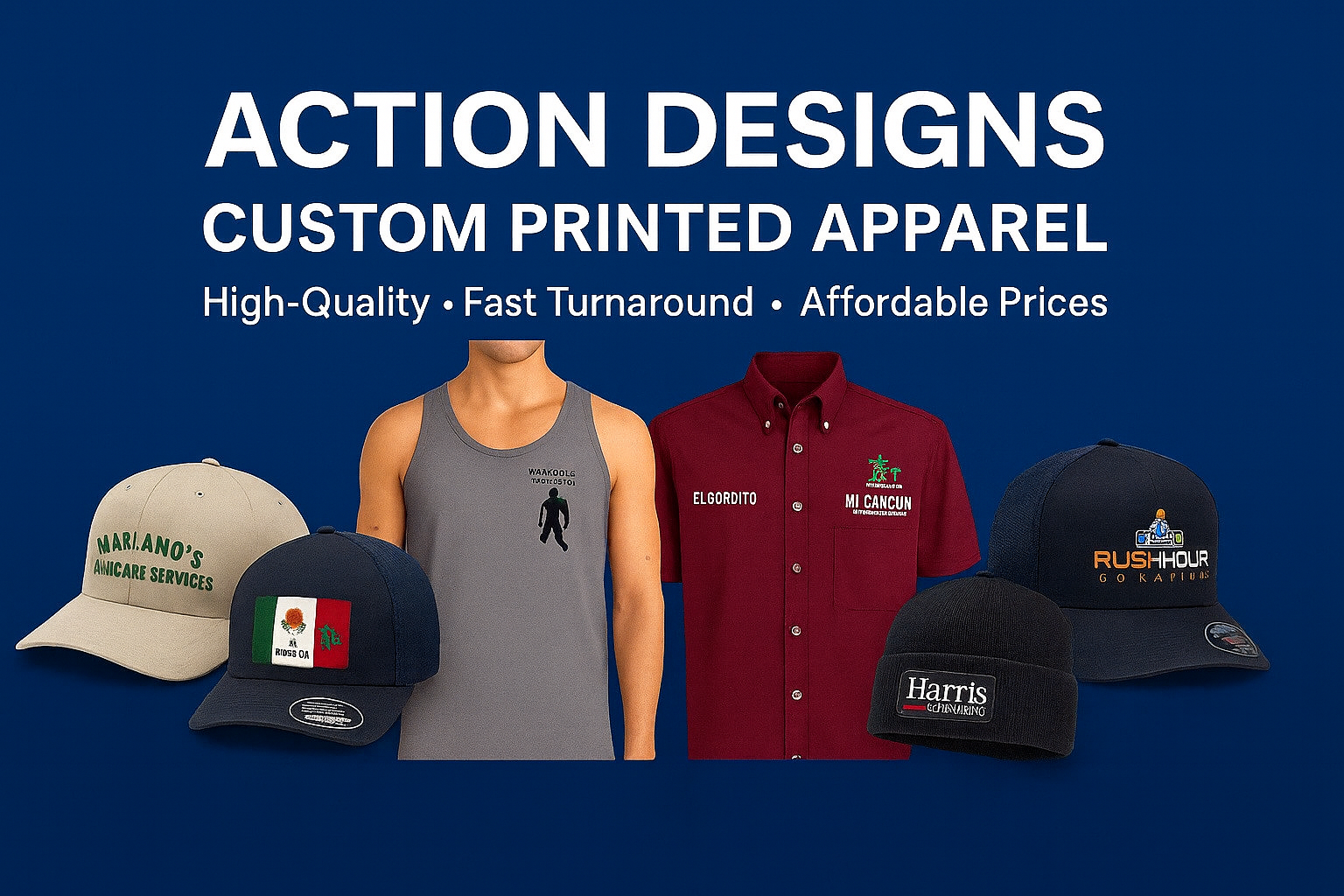 At Action Designs, we specialize in custom screen printing and embroidery to bring your ideas to life. From bold graphic tees to detailed embroidery on jackets, we deliver high-quality, personalized apparel that makes your brand or personal style stand out.